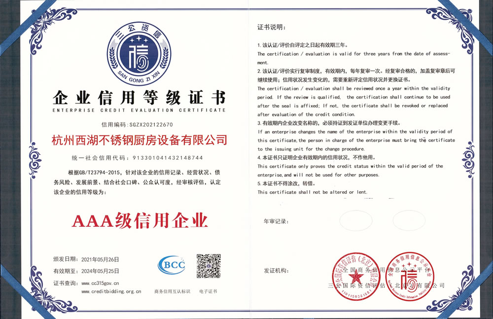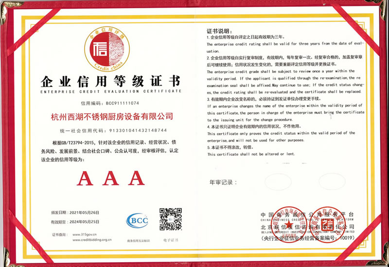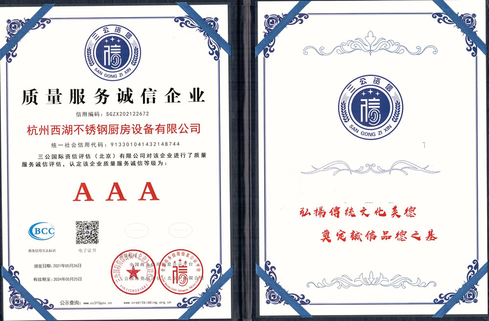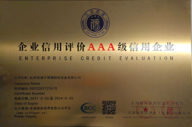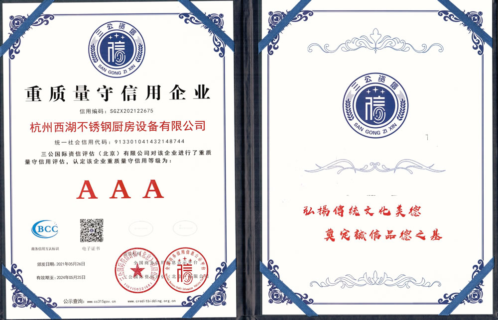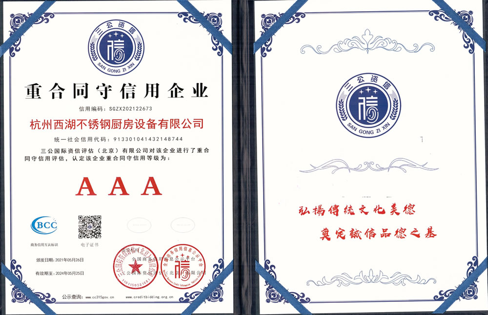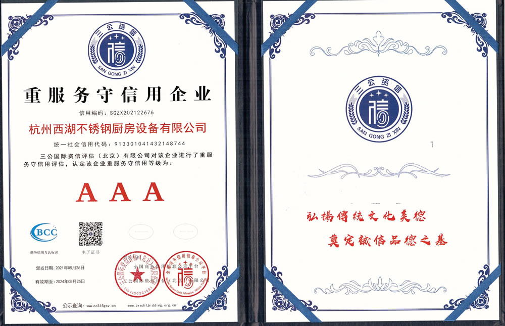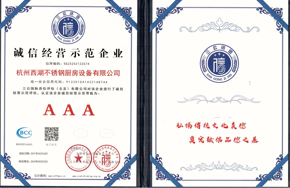 杭州西湖不銹鋼廚房設(shè)備有限公司成立20年以來,通過一系列創(chuàng)造性的工作,凝聚企業(yè)力量,發(fā)揮自身優(yōu)勢,助推企業(yè)發(fā)展和品牌建設(shè),取得了一些榮譽,這是廣大西湖廚房設(shè)備員工共同努力和各位新老客戶共同支持的結(jié)果,我們將再接再厲創(chuàng)造更多的輝煌!